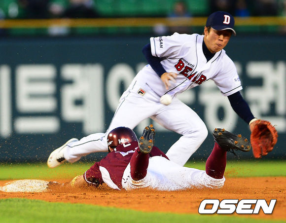 21일 오후 서울 잠실구장에서 열린 2013 한국야쿠르트 세븐프로야구 두산 베어스와 넥센 히어로즈의 경기, 두산 선발 김상현이 4회초 무사 주자 1루 넥센 장기영 타석에서 1루 주자 서건창이 2루 도루를 시도, 두산 양의지 포수의 실책으로 볼이 빠지고 있다.