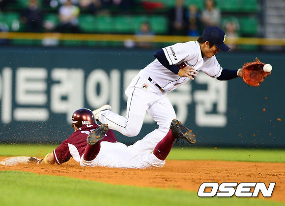 21일 오후 서울 잠실구장에서 열린 2013 한국야쿠르트 세븐프로야구 두산 베어스와 넥센 히어로즈의 경기, 두산 선발 김상현이 4회초 무사 주자 1루 넥센 장기영 타석에서 1루 주자 서건창이 2루 도루를 시도, 두산 양의지 포수의 실책으로 볼이 빠지고 있다.