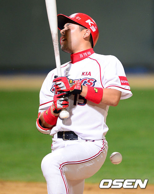 21일 오후 광주 무등야구장에서 열린 '2013 한국야쿠르트 세븐 프로야구' KIA 타이거즈와 한화 이글스의 경기, 5회말 1사에서 KIA 이용규가 한화 이브랜드의 투구에 맞고 있다.