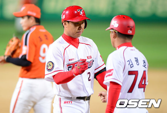 21일 오후 광주 무등야구장에서 열린 '2013 한국야쿠르트 세븐 프로야구' KIA 타이거즈와 한화 이글스의 경기, 5회말 1사 1,2루에서 KIA 이범호가 중전 적시타를 치고 김평호 코치와 하이파이브를 하고 있다.