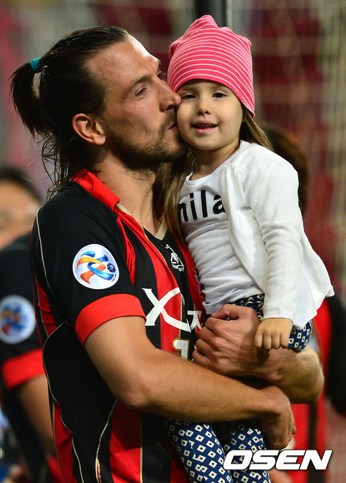 경기 종료 직후 FC서울 데얀이 딸과 함께 팬들에게 인사하며 승리의 기쁨을 만끽하고 있다.