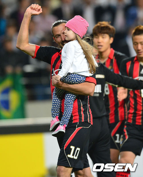 경기 종료 직후 FC서울 데얀이 딸과 함께 팬들에게 인사하며 승리의 기쁨을 만끽하고 있다.
