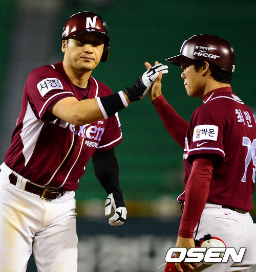 21일 오후 서울 잠실구장에서 열린 2013 한국야쿠르트 세븐프로야구 두산 베어스와 넥센 히어로즈의 경기, 5회초 1사 주자 만루 넥센 이택근이 1타점 적시타를 날린 후 1루에서 최만호 코치와 하이파이브를 하고 있다.