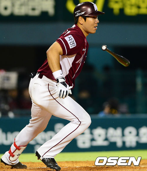 21일 오후 서울 잠실구장에서 열린 2013 한국야쿠르트 세븐프로야구 두산 베어스와 넥센 히어로즈의 경기, 5회초 1사 주자 만루 넥센 강정호가 우익수 앞 2타점 적시타를 날리고 있다.