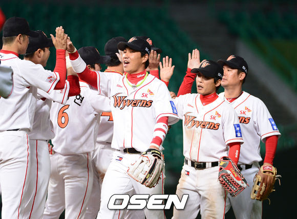 경기 종료후 8회말 쇄기를 박는 싹슬이 안타를 날린 김강민이 선수들과 승리의 기쁨을 나누고 있다./ ajyoung@osen.co.kr