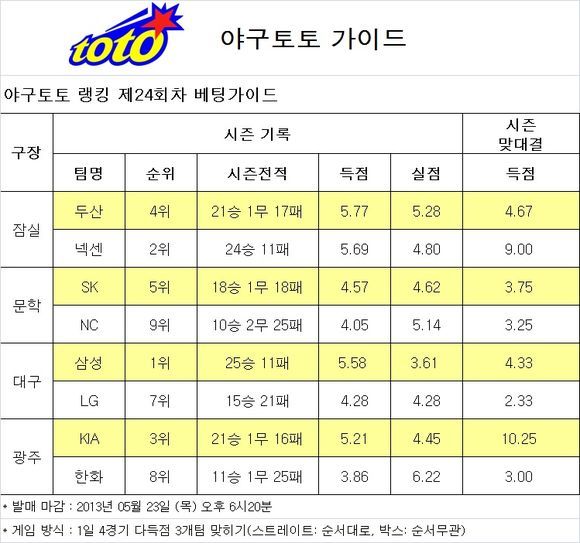 국민체육진흥공단(www.kspo.or.kr)이 발행하는 체육진흥투표권 수탁사업자인 스포츠토토 공식발매사이트인 베트맨(www.betman.co.kr)은 23일에 개최되는 두산-넥센, SK-NC, 삼성-LG, KIA-한화 등 4경기 8개팀을 대상으로 한 야구토토 랭킹 24회차 스트레이트 게임 중간집계결과 삼성(54.08%), 넥센(46.69%), KIA(43.57%)를 차례로 다득점 상위 3개팀으로 꼽았다고 밝혔다. 반면 LG(25.82%), 한화(24.40%)는 가장 적은 득점을 기록할 것으로 예상했다.