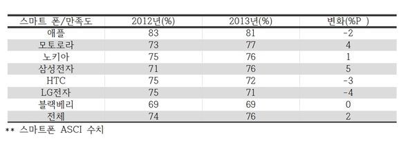 애플이 만족도 81%로 1위를 차지했지만, 상위 5개 스마트폰 중 유일하게 만족도가 하락했다. 애플은 지난해 83%의 만족도를 얻었지만, 이번 조사에서 2% 포인트가 하락했다. 모토로라, 노키아, 삼성전자는 지난해 대비 각각 5%, 1%, 4% 포인트 만족도 증가를 보인 것과는 대조적이다.