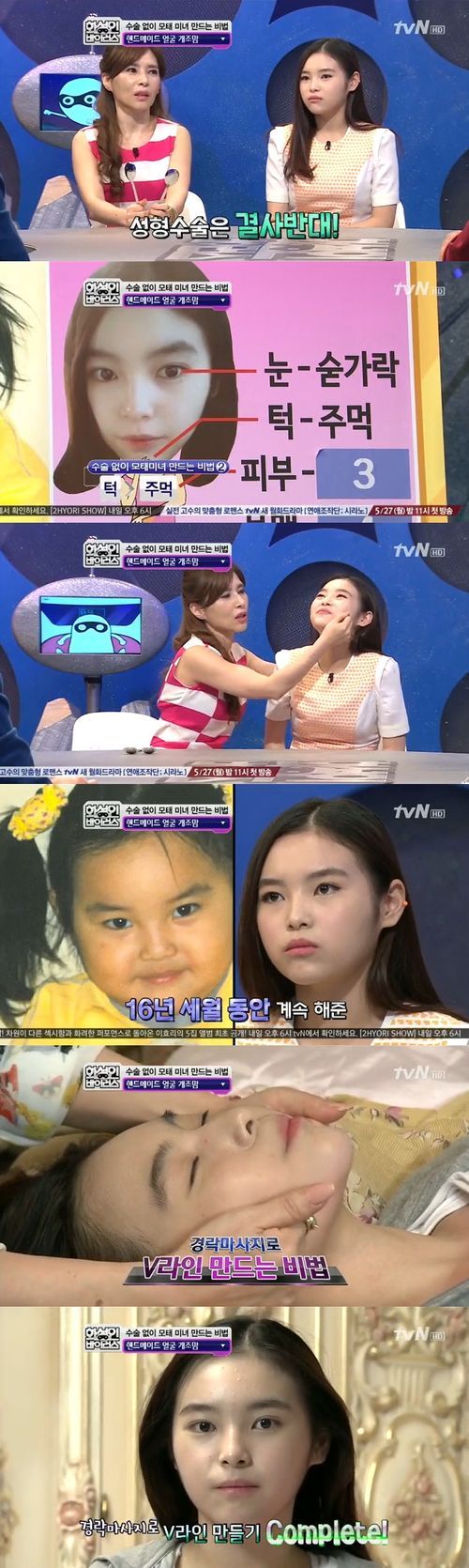 쌍꺼풀을 만들어주기 위해 아침마다 냉동숟가락으로 눈을 마사지한 얼굴개조맘은 “꾸준히 하다 보니 6살 때 양쪽 쌍꺼풀이 다 잡혔더라”라고 말해 MC들을 깜짝 놀라게 했다. 이뿐 아니라 얼굴개조맘은 딸의 둥근 얼굴을 브이(V)라인으로 만들기 위해 매일 경락 마사지까지 했다. 얼굴개조맘은 “경락 마사지는 어렸을 때부터 지금까지 계속 하고 있다”며 “엑스레이를 찍어놨으면 증거자료가 됐을 거다”고 말했다.
