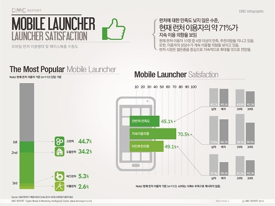 DMC미디어가 최근 발표한 ‘스마트폰 런처 이용행태 및 페이스북 홈 수용도’에 대해 조사한 인포그래픽 보고서에 따르면, 스마트폰 이용자의 15.9%가 현재 런처를 이용하고 있으며, 그 중 70.5%는 지속적으로 런처를 이용할 것이라고 응답했다. 또한 응답자의 31.4%가 최근 1년간 런처를 이용해 본 것으로 조사됐다.