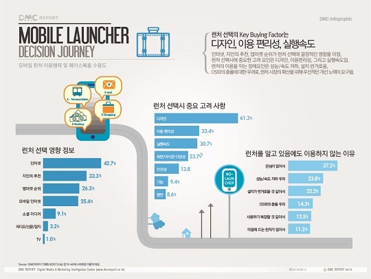 런처 선택에 가장 영향을 받는 정보로는 인터넷(42.7%)이라고 답한 응답자가 가장 많았으며, 그 뒤로 지인추천(33.3%), 앱 마켓 순위(26.3%) 등이 꼽혔다.