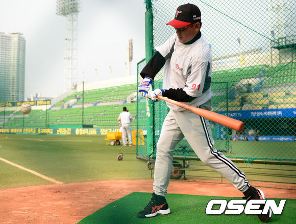 22일 오후 대구구장에서 열리는 '2013 한국야쿠르트 세븐 프로야구' 삼성 라이온즈 대 LG 트윈스와의 경기를 앞두고 LG 김기태 감독이 베팅케이지에 들어서서 타격연습을 하고 있다.