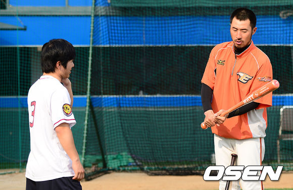 22일 오후 광주 무등야구장에서 열린 '2013 한국야쿠르트 세븐 프로야구' KIA 타이거즈와 한화 이글스의 경기, 경기에 앞서 한화 김경언이 KIA 김선빈에게 선물 받은 배트를 휘두르고 있다.
