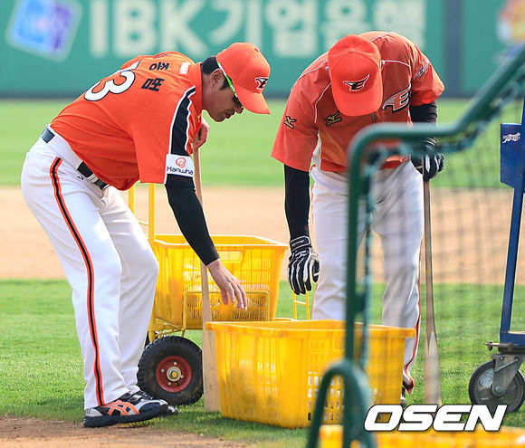 22일 오후 광주 무등야구장에서 열린 '2013 한국야쿠르트 세븐 프로야구' KIA 타이거즈와 한화 이글스의 경기, 경기에 앞서 한화 이종범 코치가 배팅볼을 정리하고 있다.