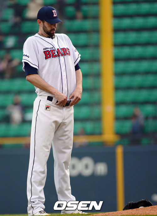 22일 오후 잠실야구장에서 열린 '2013 한국야쿠르트 세븐 프로야구'두산 베어스와 넥센 히어로즈 경기,두산 선발 니퍼트가 경기에 앞서 유니폼을 고쳐입고 있다.