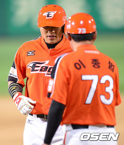 22일 오후 광주 무등야구장에서 열린 '2013 한국야쿠르트 세븐 프로야구' KIA 타이거즈와 한화 이글스의 경기, 4회초 1사 1,3루에서 한화 박노민이 중전 적시타를 치고 이종범 코치와 하이파이브를 하고 있다.