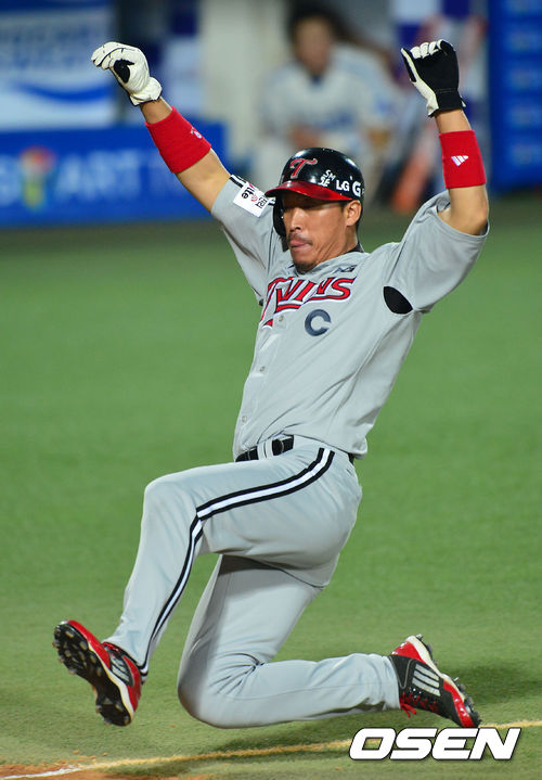 22일 오후 대구구장에서 '2013 한국야쿠르트 세븐 프로야구' 삼성 라이온즈 대 LG 트윈스와의 경기가 열렸다. 5회초 LG 공격 1사 만루 상황 대타 박용택의 희생플라이 때 3루 주자 이병규가 홈으로 태그업해 슬라이딩하고 있다.