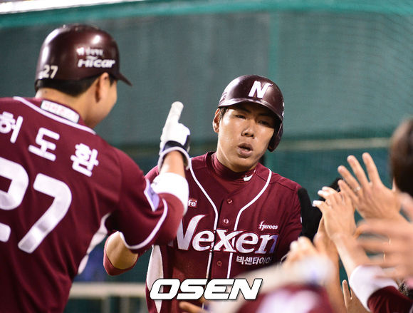 22일 오후 잠실야구장에서 열린 '2013 한국야쿠르트 세븐 프로야구'두산 베어스와 넥센 히어로즈 경기,6회초 1사 2,3루 오윤의 적시타때 2루주자 강정호 득점을 올리며 동료들의 축하를 받고 있다