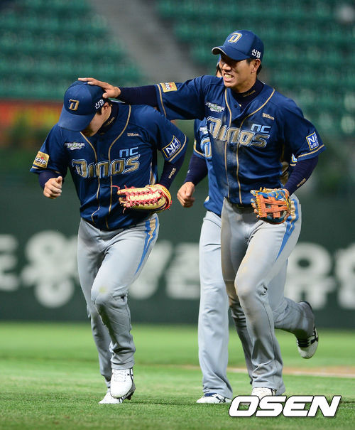 22일 오후 인천 문학구장에서 열린 2013 한국야쿠르트 세븐프로야구 SK 와이번스와 NC 다이노스의 경기, 5회말 1사 1,2루에서 SK 박재상의 타구를 슬라이딩하며 잡아내고 2루로 송구해 병살로 처리한 NC 권희동이 더그아웃으로 향하며 모창민의 격려를 받고 있다.