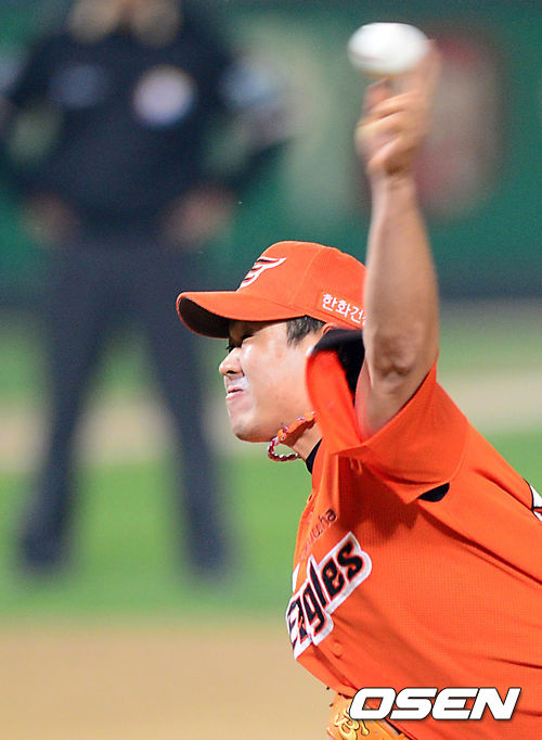 22일 오후 광주 무등야구장에서 열린 '2013 한국야쿠르트 세븐 프로야구' KIA 타이거즈와 한화 이글스의 경기, 7회말 한화 김경태가 힘차게 공을 던지고 있다.