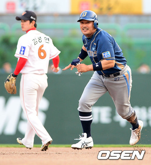 22일 오후 인천 문학구장에서 열린 2013 한국야쿠르트 세븐프로야구 SK 와이번스와 NC 다이노스의 경기, 1회초 2사 1루에서 2루 도루를 시도한 NC 이호준이 볼이 빠진 틈을 이용해 3루로 향하고 있다.하지만 모창민이 삼진으로 공격이 끝난 것을 뒤늦게 알고 허탈한 웃음을 짓고 있다.
