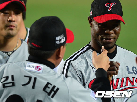 1실점하며 완투승을 거둔 LG 선발투수 리즈가 김기태 감독과 손가락 세리머니를 하고 있다./dreamer@osen.co.kr