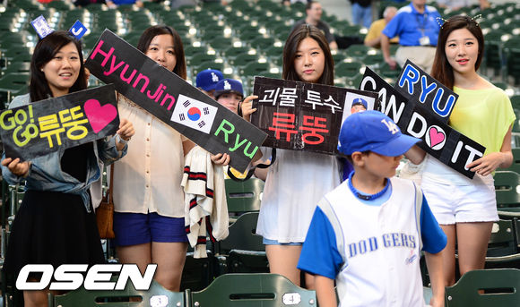 23일 새벽(이하 한국시간) 미국 위스콘신주 밀워키 밀러파크에서 열리는 LA 다저스와 밀워키 브루어스의 경기 시작 전 류현진 여성 팬들이 포즈를 취하고 있다.