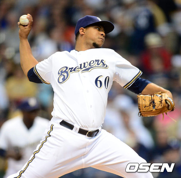 23일 새벽(이하 한국시간) 미국 위스콘신주 밀워키 밀러파크에서 열리는 LA 다저스와 밀워키 브루어스의 경기, 밀워키의 선발 윌리 페랄타가 힘차게 공을 뿌리고 있다.
