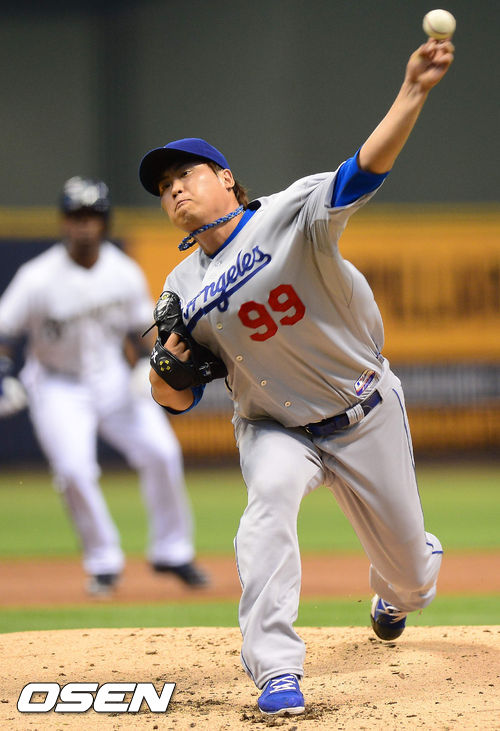 23일 새벽(이하 한국시간) 미국 위스콘신주 밀워키 밀러파크에서 열리는 LA 다저스와 밀워키 브루어스의 경기, LA 다저스 선발 류현진이 힘차게 공을 뿌리고 있다.