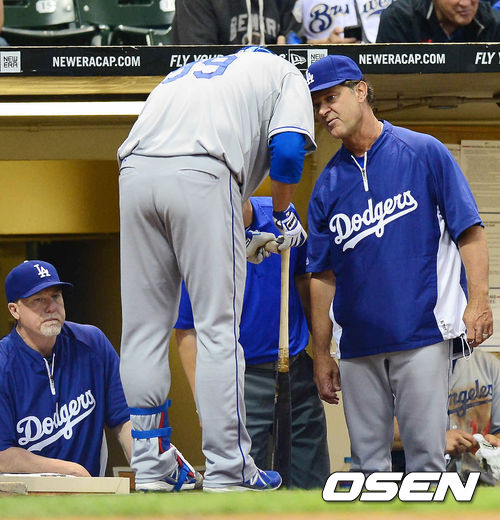 23일 새벽(이하 한국시간) 미국 위스콘신주 밀워키 밀러파크에서 열리는 LA 다저스와 밀워키 브루어스의 경기,2회초 무사 주자 만루 LA 다저스 류현진이 타석으로 나갈때 돈 매팅리 감독과 얘기를 나누고 있다.