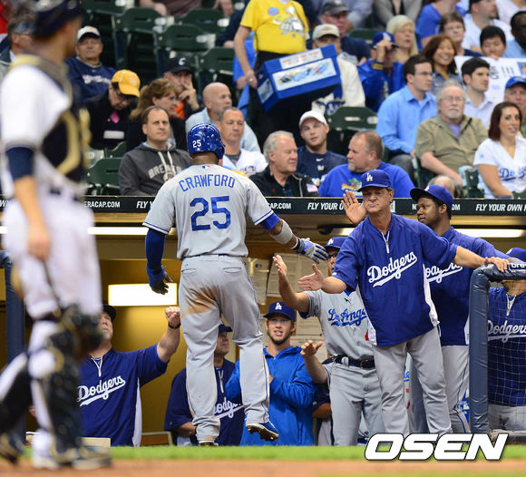 OSEN=밀워키(위스콘신), 백승철 기자] 23일 새벽(이하 한국시간) 미국 위스콘신주 밀워키 밀러파크에서 열리는 LA 다저스와 밀워키 브루어스의 경기, LA 다저스 선발 류현진이 2회초 2사 주자 만루 LA 다저스 밴 슬라이크가 볼넷을 얻어내며 밀어내기로 홈을 밟은 칼 크로포드가 덕아웃에서 돈 매팅리 감독과 하이파이브를 하고 있다.