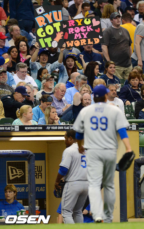 23일 새벽(이하 한국시간) 미국 위스콘신주 밀워키 밀러파크에서 열리는 LA 다저스와 밀워키 브루어스의 경기, LA 다저스 선발 류현진이 2회를 마친 후 덕아웃으로 들어올때 류현진 팬들이 열띤 응원을 펼치고 있다.