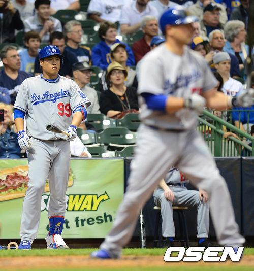 23일 새벽(이하 한국시간) 미국 위스콘신주 밀워키 밀러파크에서 열리는 LA 다저스와 밀워키 브루어스의 경기, LA 다저스 선발 류현진이 2회 무사 주자 1,2루 에르난데스의 타석을 지켜보며 타석에 설 준비를 하고 있다.