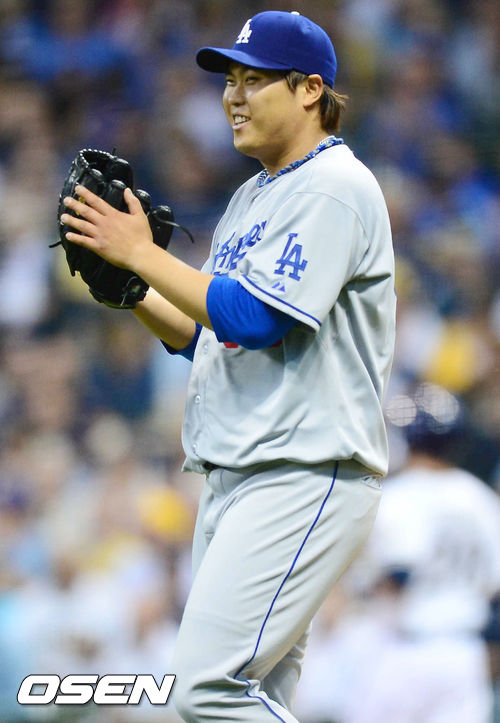 23일 새벽(이하 한국시간) 미국 위스콘신주 밀워키 밀러파크에서 열리는 LA 다저스와 밀워키 브루어스의 경기,4회말 밀워키의 선두타자 루크로이의 타구를 유격수 땅볼 아웃 처리하자 류현진이 환하게 웃으며 박수를 보내고 있다.