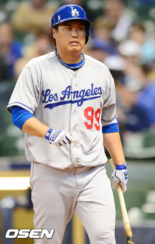 23일 새벽(이하 한국시간) 미국 위스콘신주 밀워키 밀러파크에서 열리는 LA 다저스와 밀워키 브루어스의 경기,3회초 무사 주자 없는 상황에서 LA 다저스 류현진이 타석에서 삼진 아웃을 당한 후 아쉬워하고 있다.