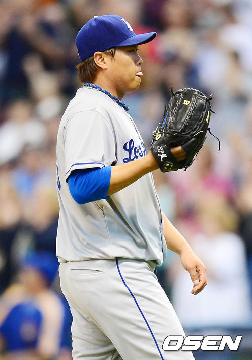 23일 새벽(이하 한국시간) 미국 위스콘신주 밀워키 밀러파크에서 열리는 LA 다저스와 밀워키 브루어스의 경기,6회말 1사 밀워키 브론에게 좌월 솔로포를 맞은 LA 다저스 선발 류현진이 아쉬운 표정을 짓고 있다.