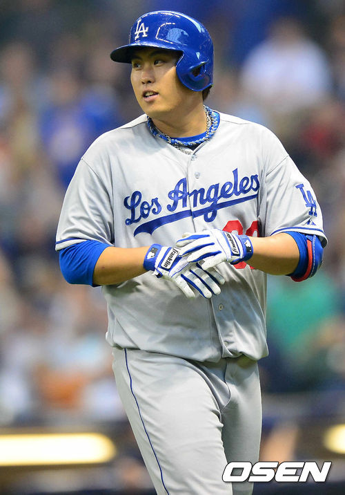 23일 새벽(이하 한국시간) 미국 위스콘신주 밀워키 밀러파크에서 열리는 LA 다저스와 밀워키 브루어스의 경기, 7회초 2사 주자 1루 LA 다저스 류현진이 좌익수플라이아웃 당한 후 아쉬워하고 있다.