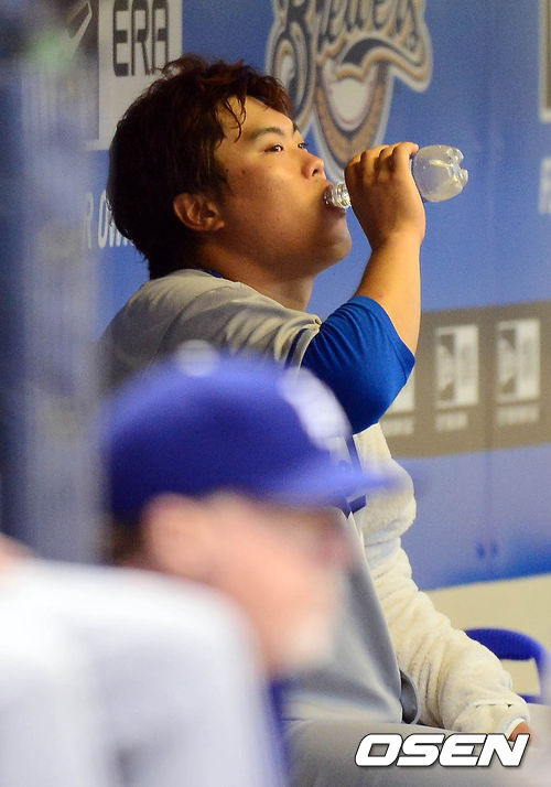 LA다저스 류현진이 7회초 덕아웃에서 경기를 지켜보며 음료를 마시고 있다. / baik@osen.co.kr