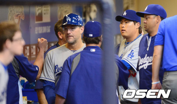 LA다저스 류현진이 8회말 1사 1루 마운드를 내려간 후 동료들과 하이파이브를 하고 있다. / baik@osen.co.kr