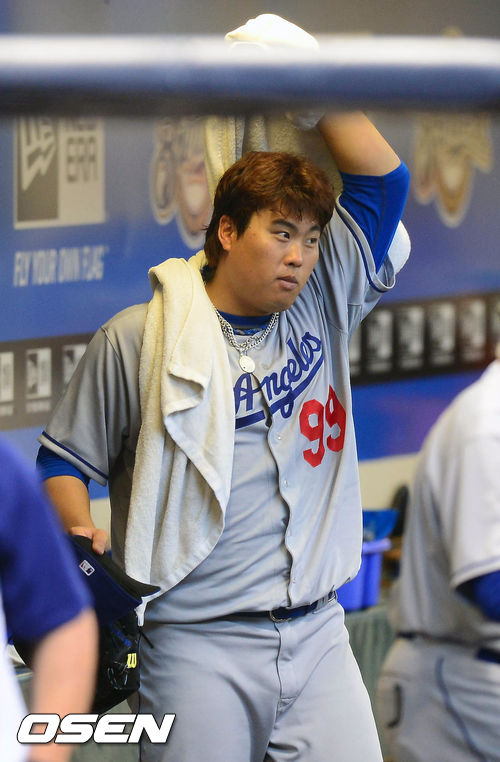 LA다저스 류현진이 8회말 1사 주자 1루 세구라 타석에서 교체되어 마운드를 내려가 덕아웃에서 손을 흔들고 있다. / baik@osen.co.kr
