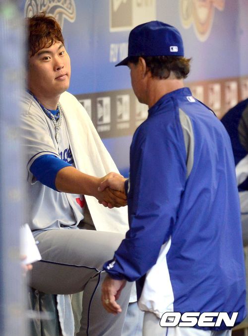 LA다저스 매팅리 감독이 경기를 마친 류현진과 악수를 나누고 있다. / baik@osen.co.kr