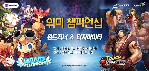 ‘윈드러너’와 ‘터치 파이터’ 등 위미 게임의 최강자를 가리는 대회가 열린다. 위메이드 엔터테인먼트는 오는 25일부터 26일까지 이틀간 고양시 일산에 위치한 복합 쇼핑몰 원마운트에서 ‘위미 챔피언십’을 개최한다고 밝혔다.