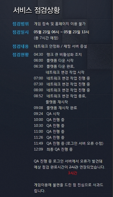 그러나 12시까지도 점검은 완료되지 못했다. 라이엇 게임즈는 점검시간을 2시간에서 3시간으로 수정하고, 오후 1시까지 서비스 점검시간을 갖는다고 홈페이지를 통해 밝힌 상황이다.