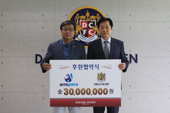 하이트진로가 대전 시티즌과 후원협약을 맺고 후원금을 전달, 대전의 승리를 응원한다.