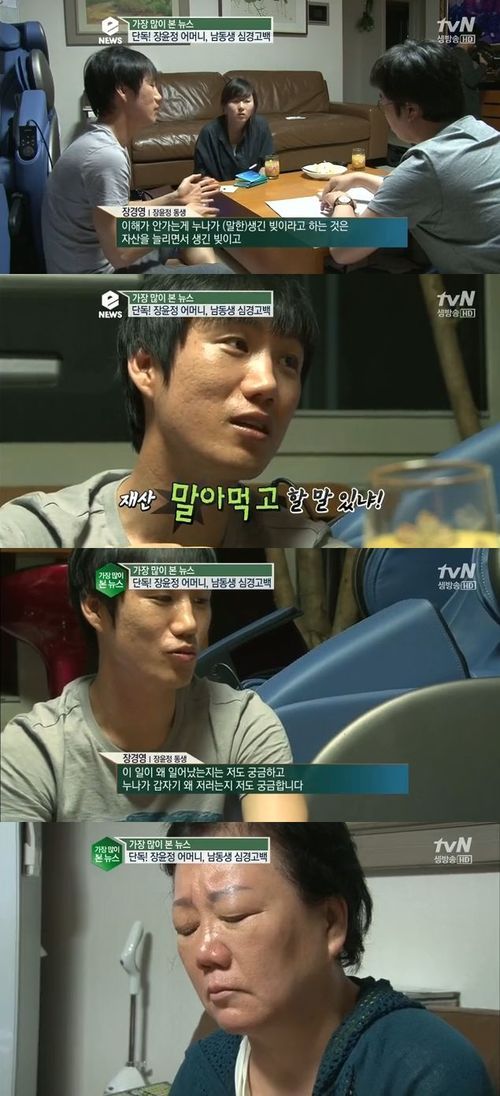 장경영 씨는 23일 오전 방송된 tvN 'E뉴스'에 출연해 자신이 운영하는 사업체의 재무 관련 자료들을 공개하며 "누나가 생긴 빚이라는 건 자신의 자산을 늘리려고 해서 생긴 빚이다. 자산관리사는 문제가 없다고 했다"며 "(경영하고 있는)회사가 건실한 회사인지 아닌지 명예회복이 필요한 것 같다"라고 말했다.