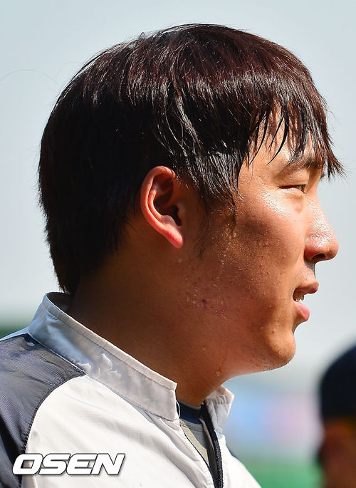23일 오후 서울 잠실구장에서 열린 2013 한국야쿠르트 세븐프로야구 두산 베어스와 넥센 히어로즈의 경기 전 두산 김현수가 타격연습을 마친 후 땀방울을 흘리고 있다.