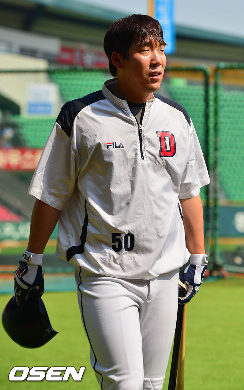 23일 오후 서울 잠실구장에서 열린 2013 한국야쿠르트 세븐프로야구 두산 베어스와 넥센 히어로즈의 경기 전 두산 김현수가 타격훈련을 마치고 덕아웃으로 들어오고 있다.