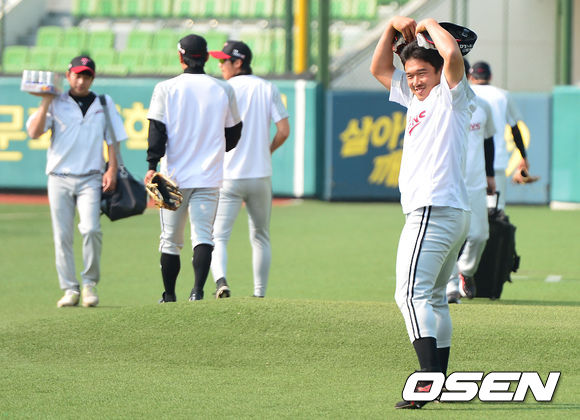 23일 오후 대구구장에서 열리는 '2013 한국야쿠르트 세븐 프로야구' 삼성 라이온즈 대 LG 트윈스와의 경기를 앞두고 LG 윤요섭이 훈련 중인 삼성 선수들을 향해 하트를 그리고 있다.