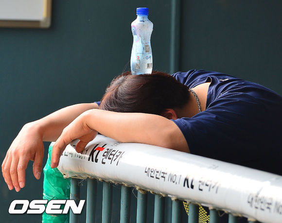 23일 오후 서울 잠실구장에서 열린 2013 한국야쿠르트 세븐프로야구 두산 베어스와 넥센 히어로즈의 경기 전 두산 김현수가 훈련을 마친 후 머리 위에 얼음 생수를 올리고 휴식을 취하고 있다.