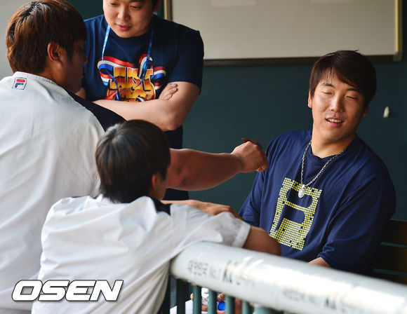 23일 오후 서울 잠실구장에서 열린 2013 한국야쿠르트 세븐프로야구 두산 베어스와 넥센 히어로즈의 경기 전 두산 김현수가 훈련을 마친 후 휴식을 취할때 최준석이 가까이 와서 김현수의 뺨을 홍삼팩으로 살짝 치고 있다.