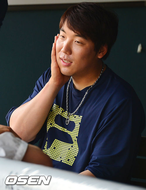 23일 오후 서울 잠실구장에서 열린 2013 한국야쿠르트 세븐프로야구 두산 베어스와 넥센 히어로즈의 경기 전 두산 김현수가 훈련을 마친 후 휴식을 취할때 최준석이 가까이 와서 김현수의 뺨을 장난으로 치자 김현수가 얼굴을 만지고 있다.